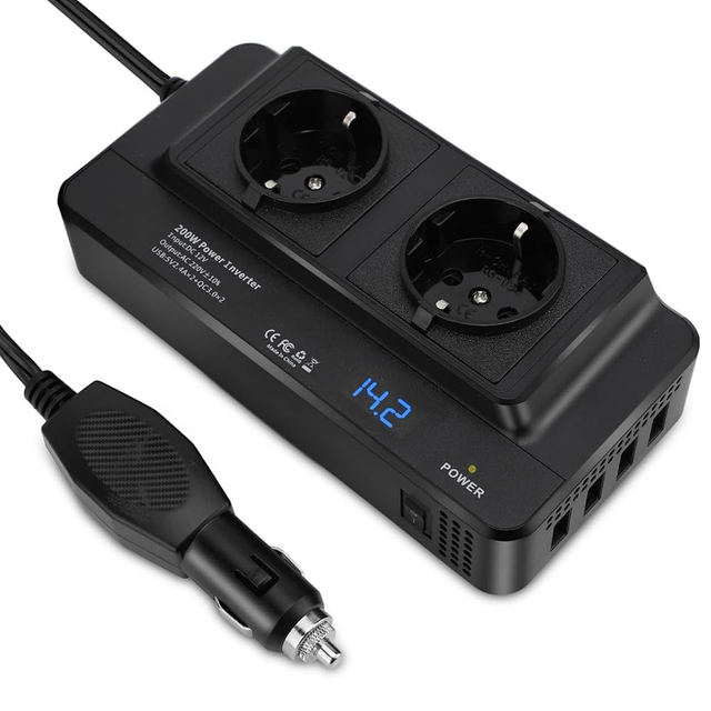 Convertisseur 12V-240V 200W pour voiture avec prises EU et 4 ports USB, transformant le courant CC en CA pour une alimentation polyvalente en déplacement.